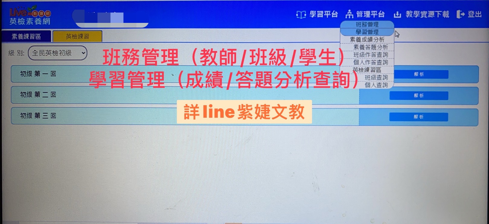- 初次使用請由管理帳號至英檢素養網top.liveabc.com/進行開卡儲值,依輸入的帳號登入後即會自動辨別身分,進入各身分所屬頁面。詳細操作辦法可參考《新手上路》