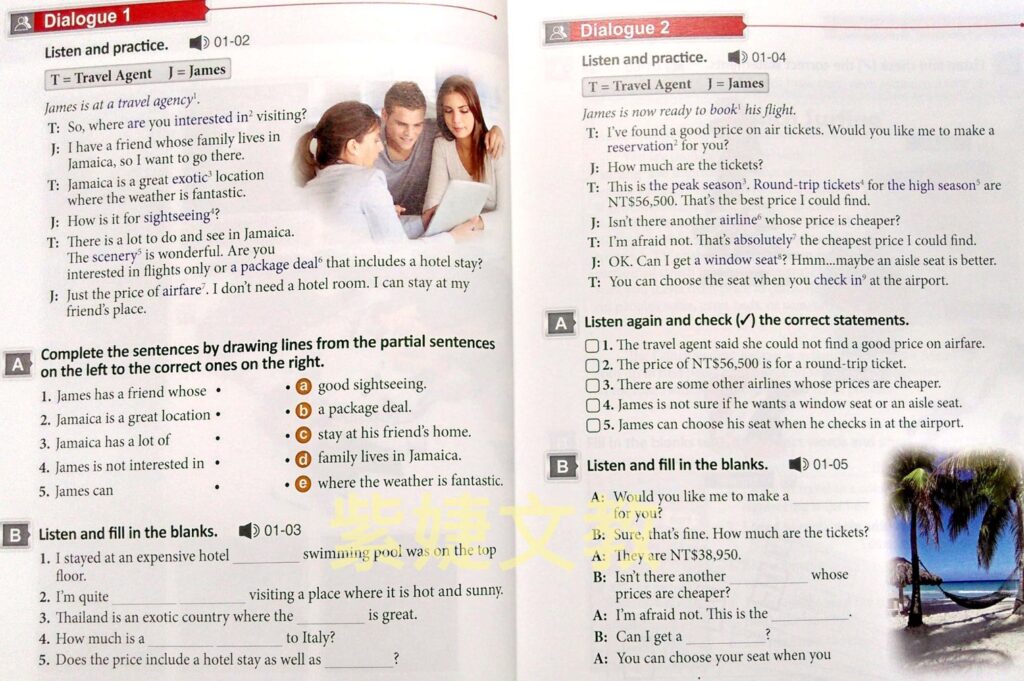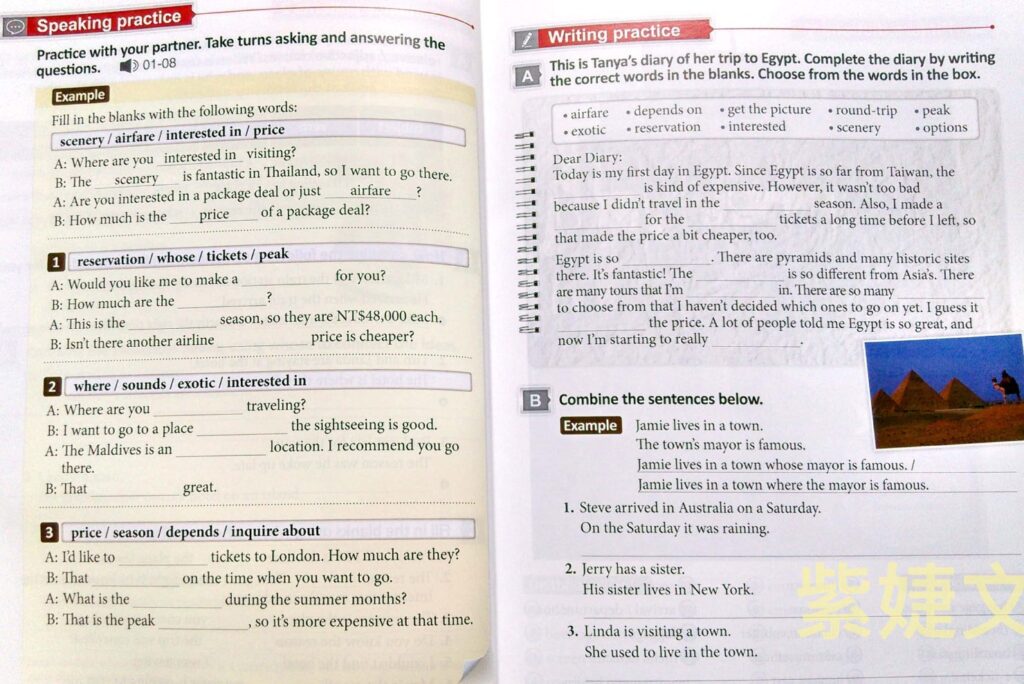 *各課所學聽、說、讀、寫內容囊括於其中,讓學生會說也能寫,除了一般的回答問題與填空外,進階程度學生可使用代換或由老師指導使用開放式答案作答。