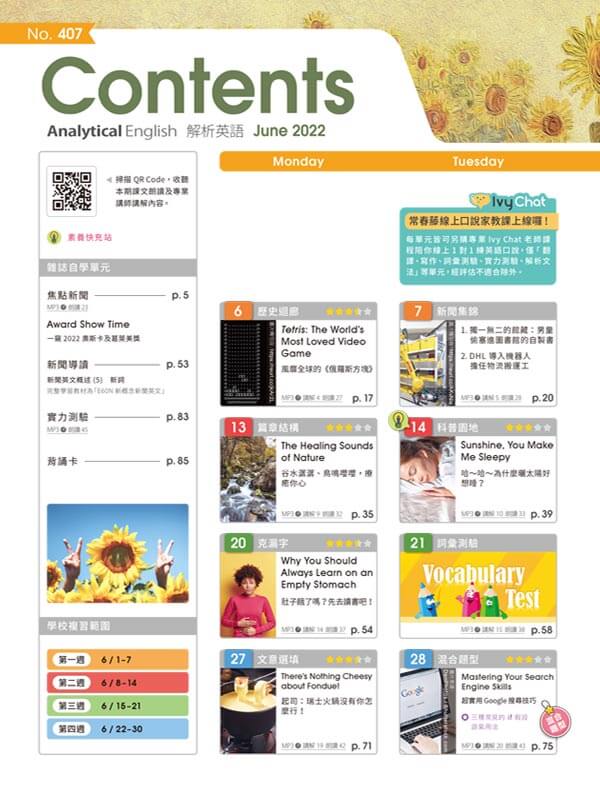 This month’s issue of Ivy Analytical English is full of fascinating articles that are sure to teach you something new. For anyone interested in learning about culture and traditions, “The Legends and Customs of the Dragon Boat Festival” is sure to be interesting. This article describes some of the legends that surround this Chinese holiday as well as some popular traditions. “The Song That Saves Lives” is an uplifting article describing a hit on the charts that has also positively impacted mental health. If you are more interested in learning about some unique animals, then “The Platypus: Breaking the Mammalian Mold for Millennia” is for you. This month’s issue even features an article about some surprising effects of sunlight with “Sunshine, You Make Me Sleepy.” These are just a few of the many intriguing and informative articles you will find in the June issue of Ivy Analytical English.