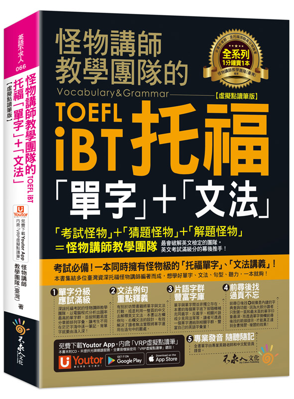 「怪物講師教學團隊(臺灣)」曾經合作過《怪物講師教學團隊的7,000「單字」+「文法」》、《怪物講師教學團隊的TOEFL iBT托福「單字」+「文法」》、《怪物講師教學團隊的IELTS雅思「單字」+「文法」》等多本暢銷書籍,獲得許多臺灣讀者的回饋和肯定,發現臺灣學生非常認同這樣的單字學習方式。而近來出版社推出了「Youtor App(內含VRP虛擬點讀筆)」的語言學習軟體,有許多讀者不斷向我們詢問,是否能讓這些書籍也搭配這個App?也因為近年政府和教育界都在推廣數位學習,因應這股潮流以及減少額外處理回收光碟的環保理念,我們決定修訂本書《怪物講師教學團隊的TOEFL iBT托福「單字」+「文法」》並推出虛擬點讀筆版本,在內容與編排也較之前更加完善!