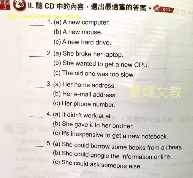 5.本書依照教育部公佈之國中英語聽力會考題型設計相關練習,並以會考圖示題點標示。學習者可加以運用學習,為聽力會考做充足的準備。