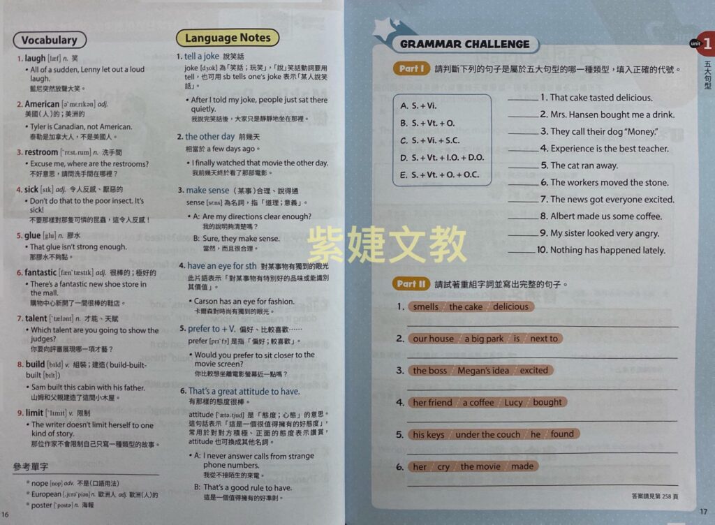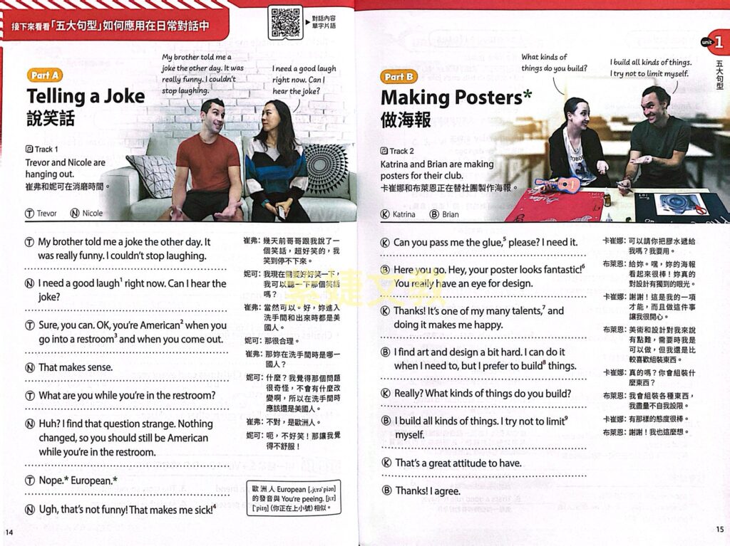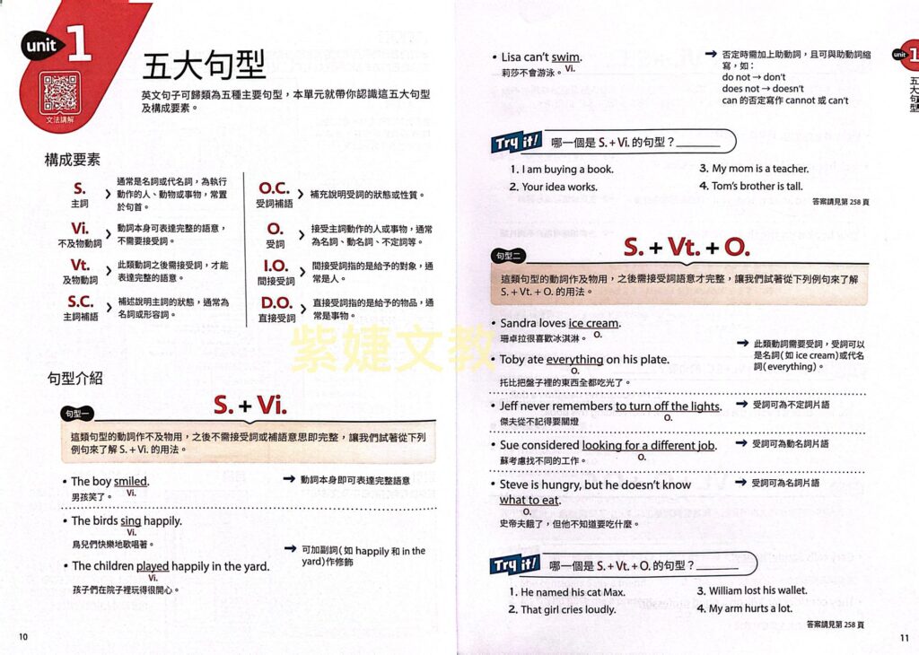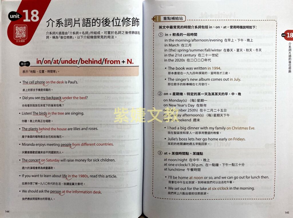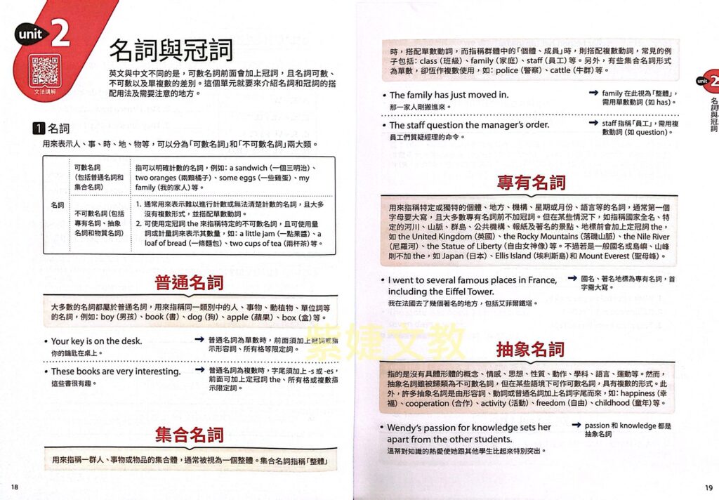 每個單元分為三部分。首先是「文法講解」部分,以簡單易懂的方式解釋語法要點,並透過圖示、表格等工具來協助理解。除了書本上的文字解釋外,我們也提供了QR code,可以使用智慧型手機掃描,立即就能線上聆聽由專業老師錄製的文法解說影片。另外還有文法小測驗,可幫助讀者評估自己對該單元的掌握情況。第二部分則是活用該單元文法概念的「實用對話」,以對話或漫畫的形式呈現,讓讀者更深入了解文法在日常生活中的應用,並提供相關的字彙和片語,同時提升語言的能力。最後一部分是「文法挑戰」,在此提供不同題型的文法測驗,讓讀者檢測自己的學習成果。讓讀者檢測自己的學習成果。