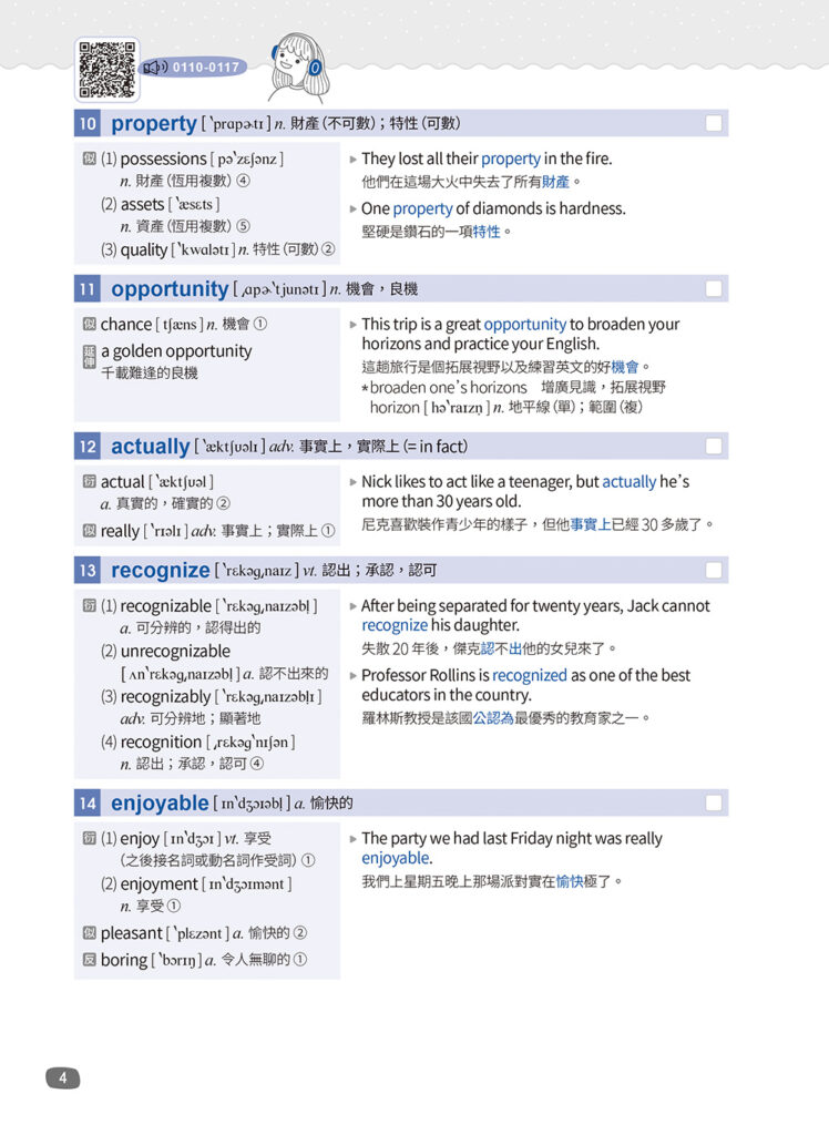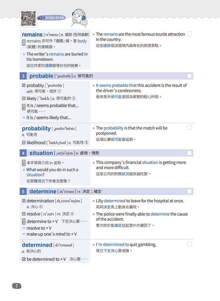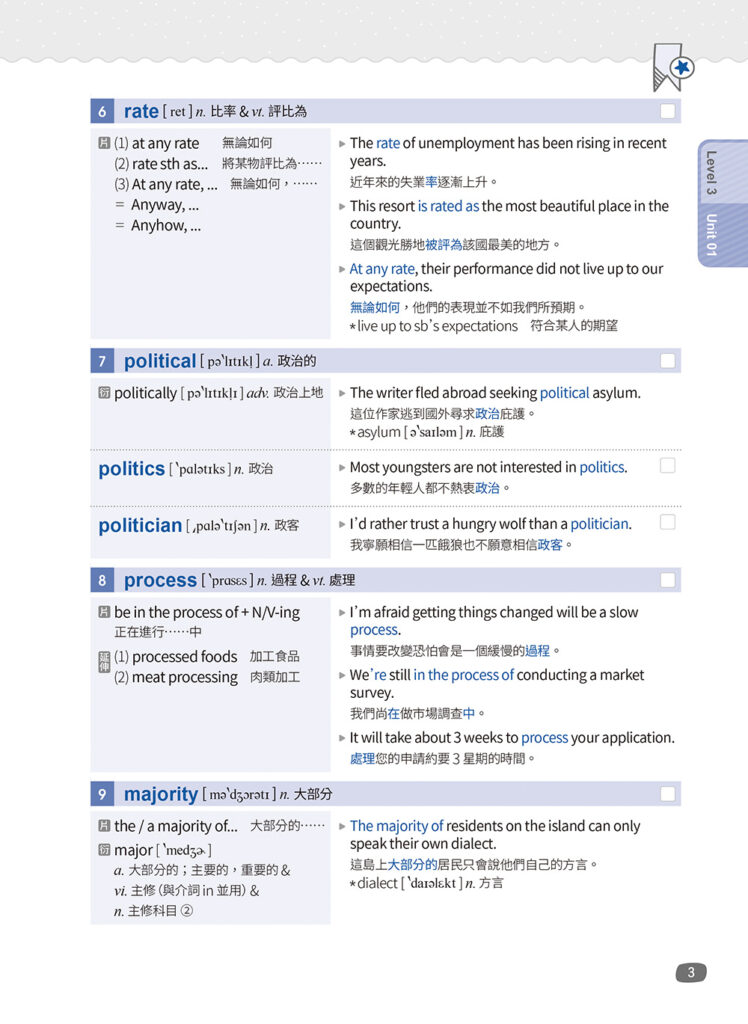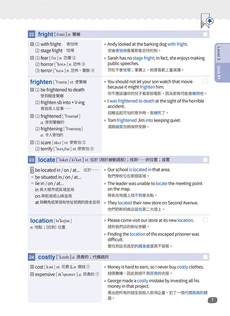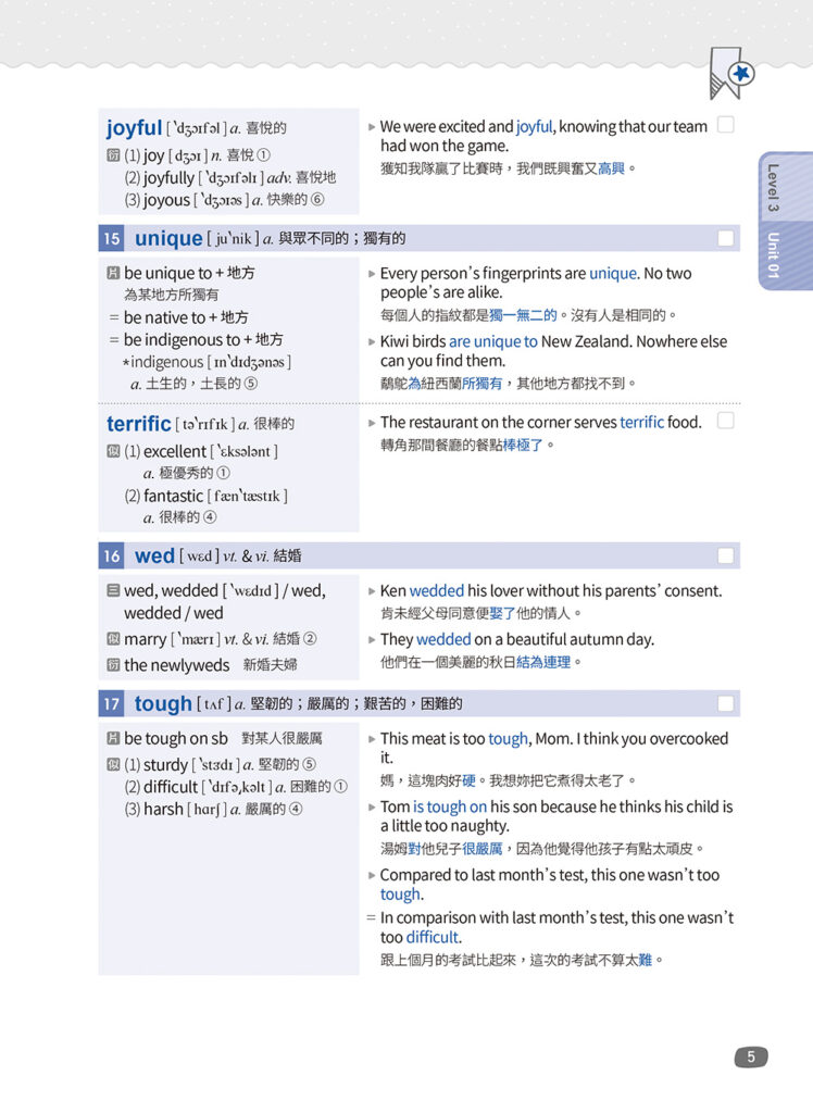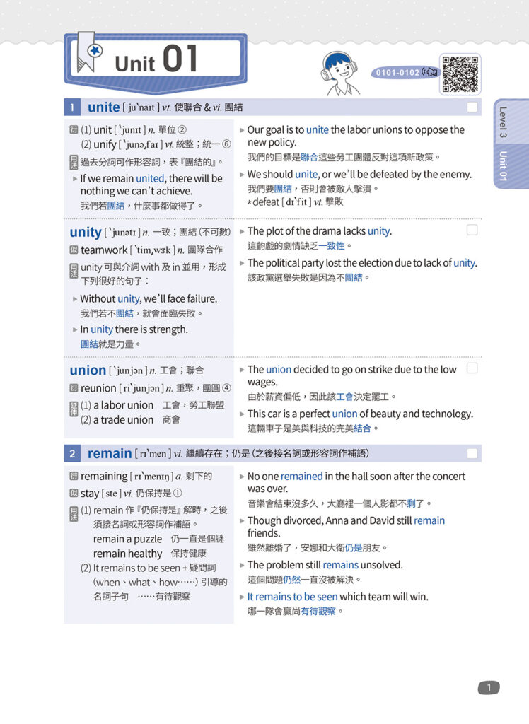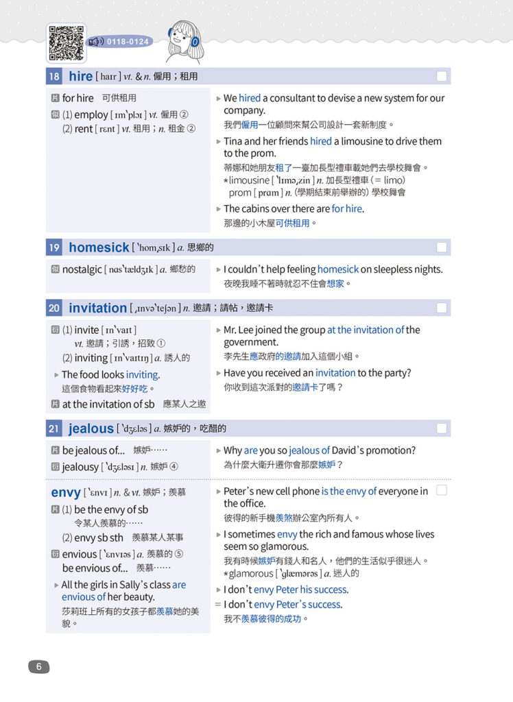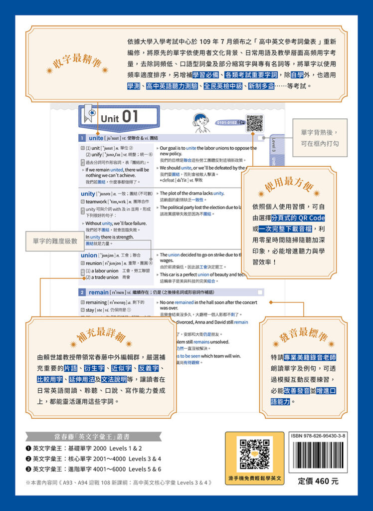 依據大學入學考試中心於 109 年 7 月頒布之「高中英文參考詞彙表」重新編修,將原先的單字依使用者文化背景、日常用語及教學層面高頻用字考量,去除詞頻低、口語型詞彙及部分縮寫字與專有名詞等,將單字以使用頻率適度排序,另增補學習必備、各類考試重要字詞,除自學外,也適用學測、高中英語聽力測驗、全民英檢中級、新制多益……等考試。