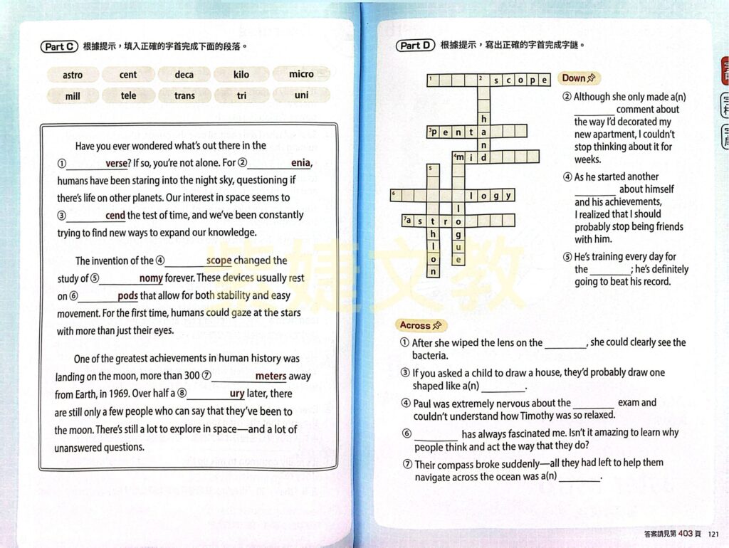 讀者可依照本書架構循序學習,每個單字均附有拆解示例與實用例句,幫助掌握字首、字根或字尾的意義,進而從字形推敲字義,使單字學習從「背誦」轉變為「理解與應用並重」。此外,每篇學習內容後都設計了多元題型的測驗,協助讀者系統掌握單字結構與意義,並即時檢視學習成果。書末更附有分類索引,方便查詢,幫助讀者建立完整的字彙量。