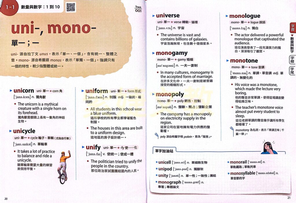 本書依循系統化脈絡,分為字首、字根、字尾三大部分,共包含306個單元,收錄超過2,500個實用單字: