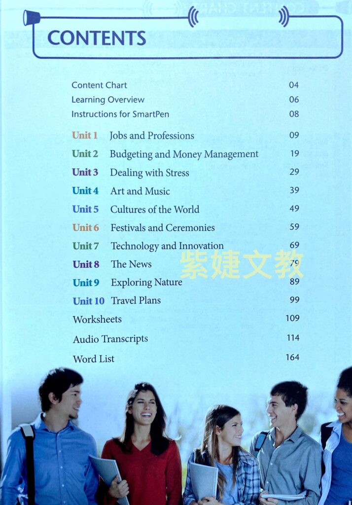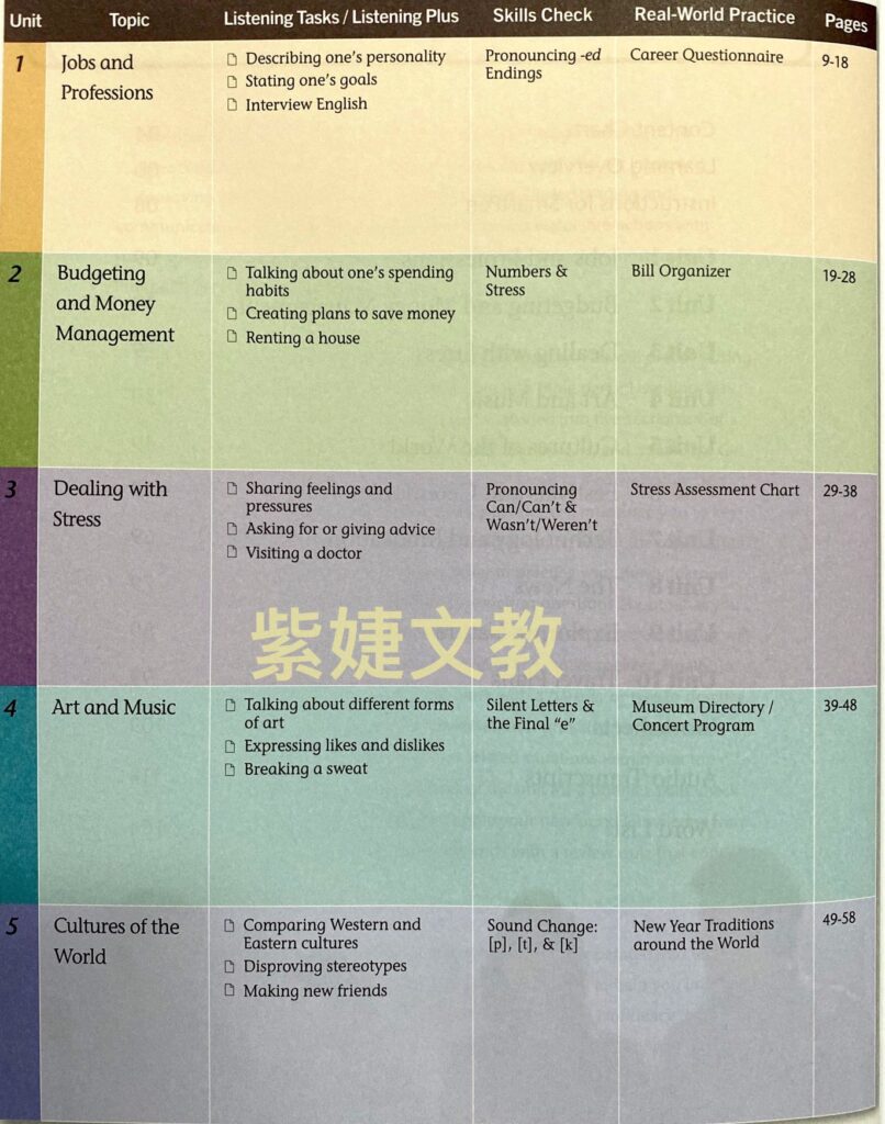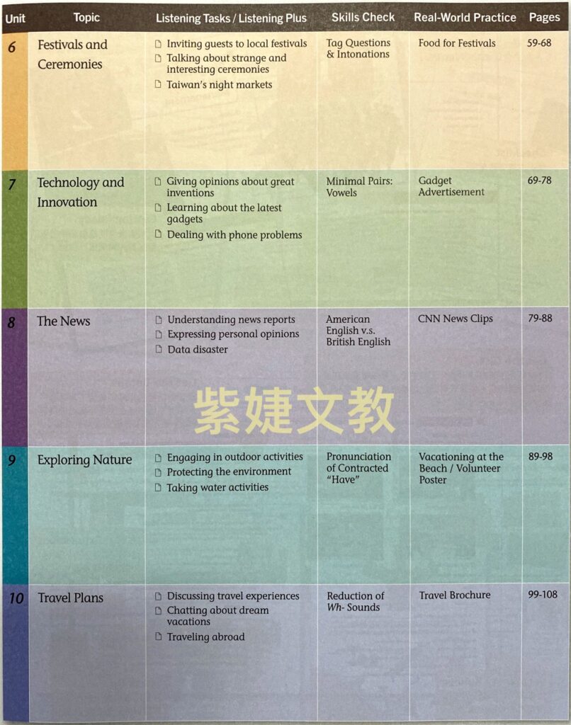 本書題材均選自實用的日常生活情境,如Budgeting and Money Management(擬定預算與理財)、Exploring Nature(探索大自然)、Art and Music(藝術與音樂)、Cultures of the World (世界文化與節慶)等,內容豐富多元,有助於提升讀者學習興趣。