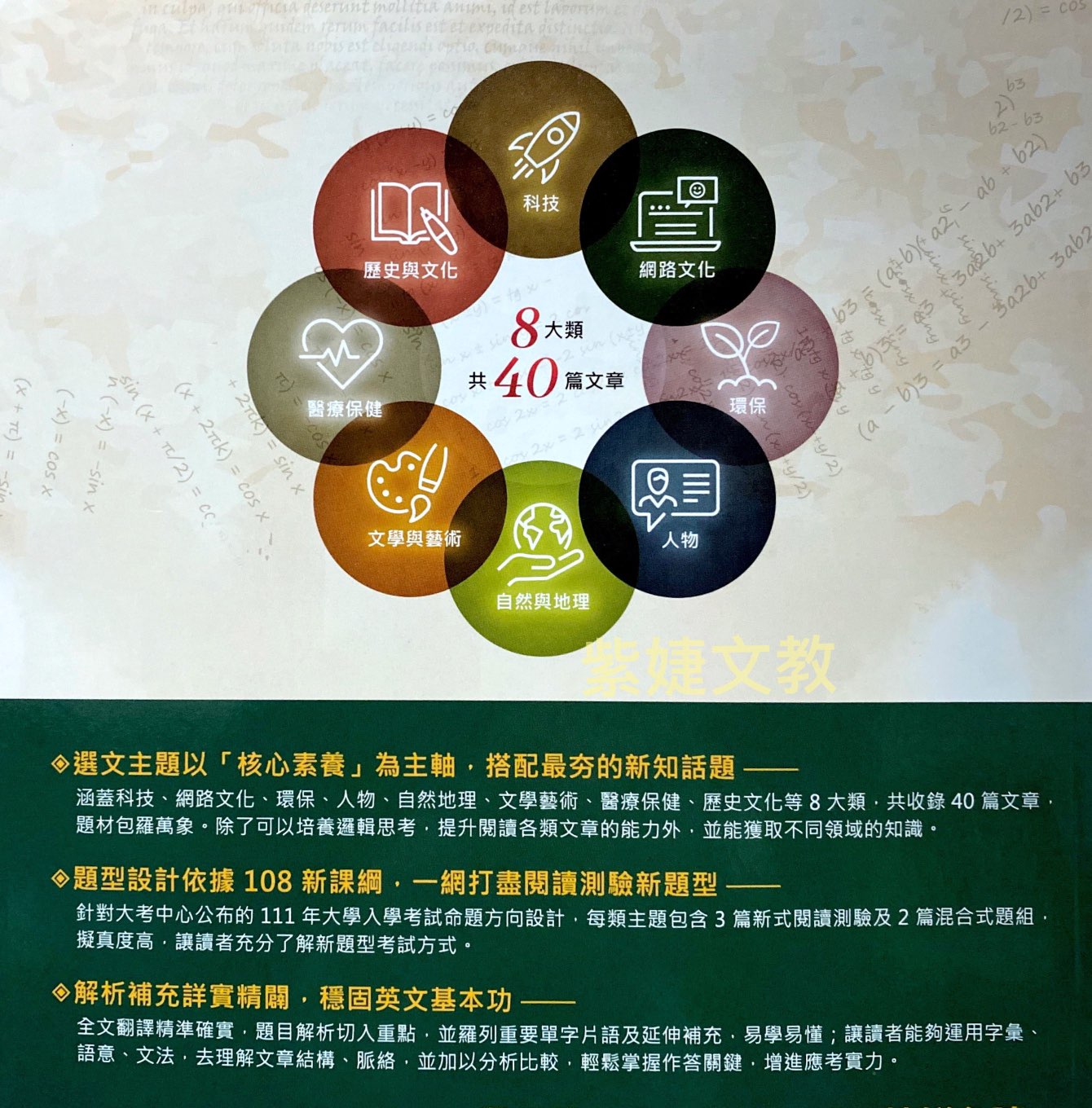 針對大考中心公布的 111 年大學入學考試命題方向設計,每類主題包含 3 篇新式閱讀測驗及 2 篇混合式題組,擬真度高,讓讀者充分了解新題型考試方式。