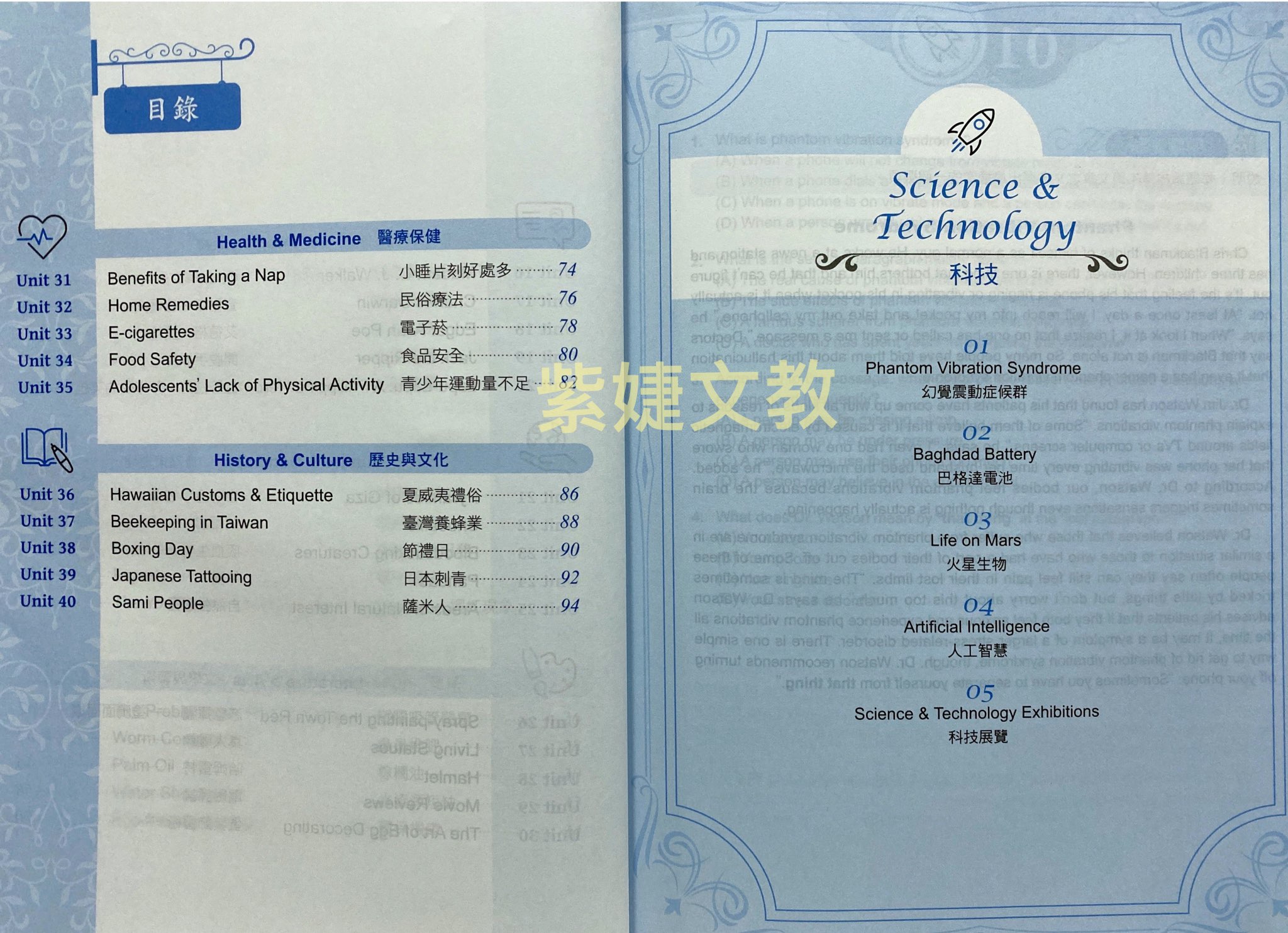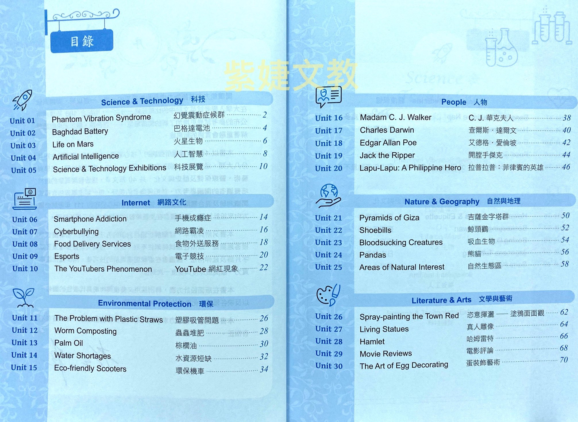 涵蓋科技、網路文化、環保、人物、自然地理、文學藝術、醫療保健、歷史文化等 8 大類,共收錄 40 篇文章,題材包羅萬象。除了可以培養邏輯思考,提升閱讀各類文章的能力外,並能獲取不同領域的知識。