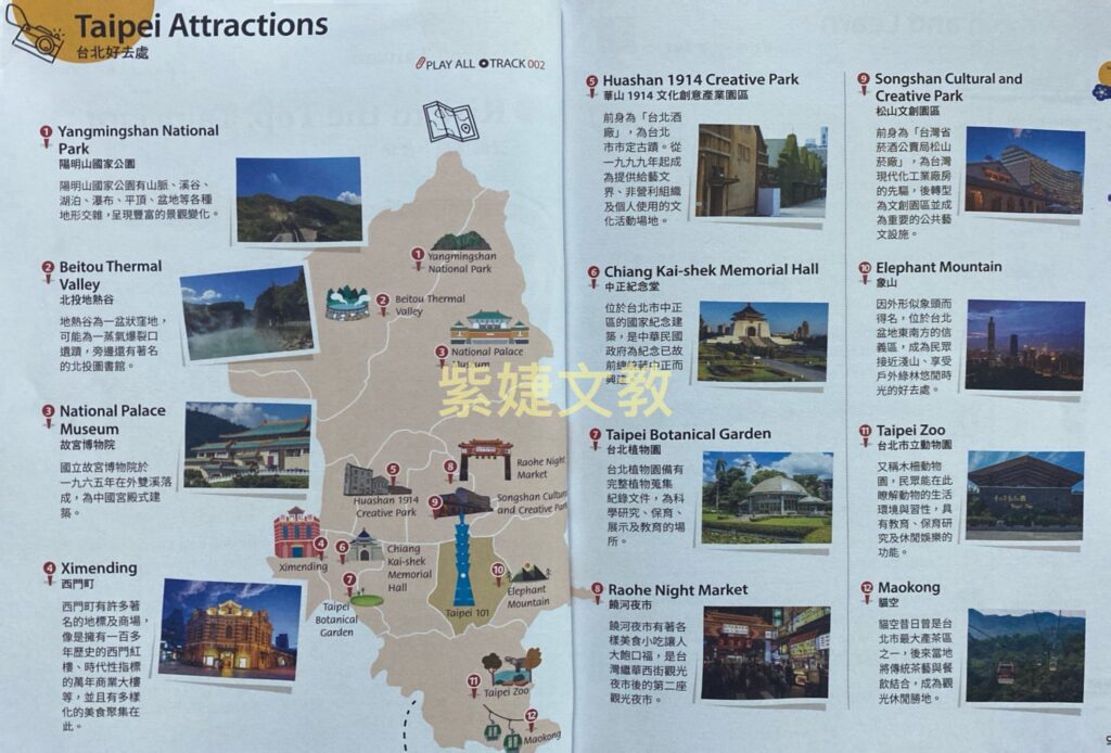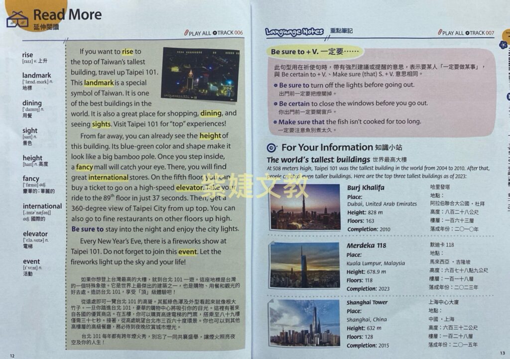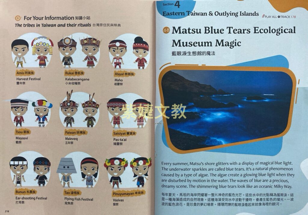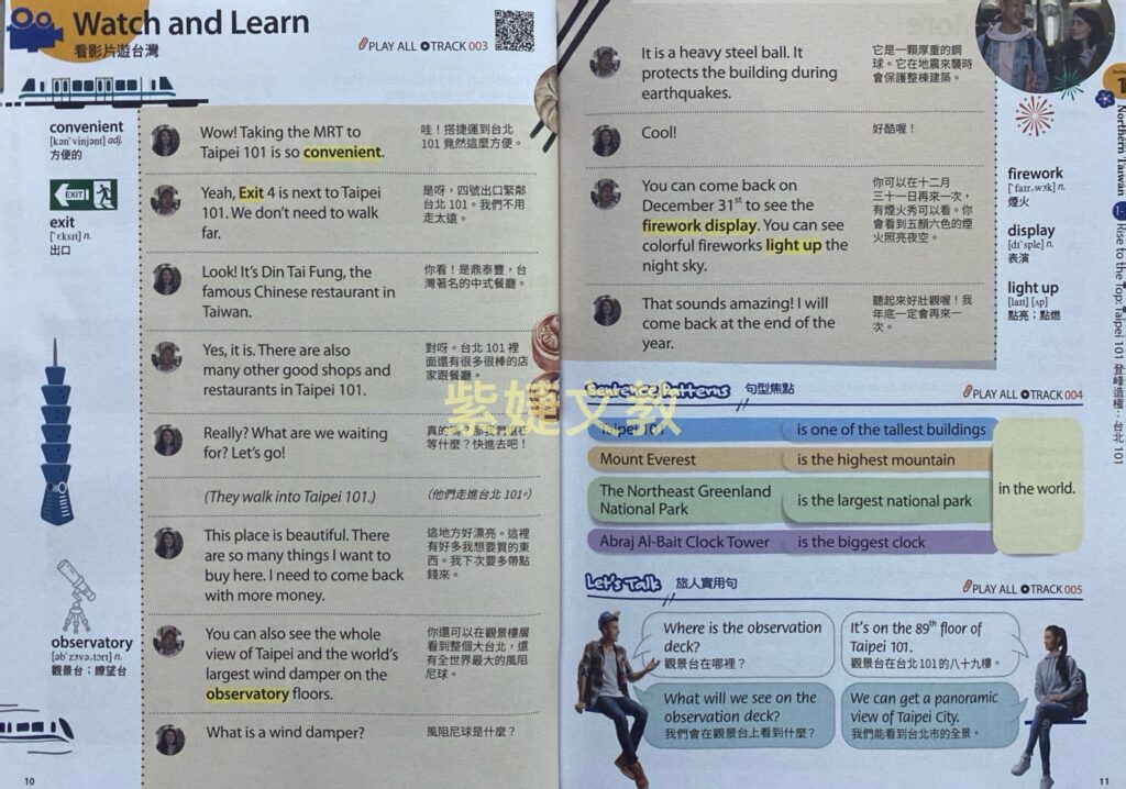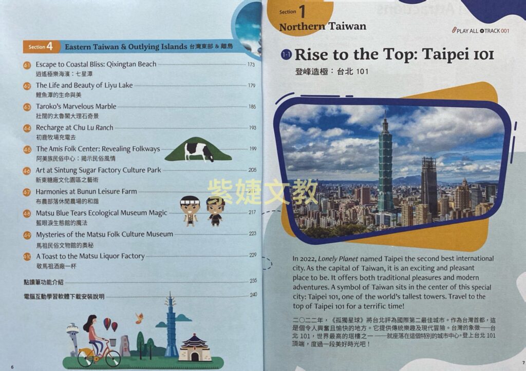 本書分為台灣北部、中部、南部及東部&離島四大部分。各課扉頁先介紹該景點的概況與特色。接著是精美的大圖解,讓讀者能藉由視覺學習的方式來認識單字。然後進入「看影片遊台灣」單元,藉由LiveABC 團隊走遍各地的影片拍攝與介紹,讓讀者也彷彿置身其中在當地遊覽。這個單元亦彙整出「句型焦點」和「旅人實用句」,讓讀者能在自身旅遊或介紹景點時靈活應用。各課程還精心規劃了「知識小站」,比如彙整台灣各地的國家公園與特色、介紹各種海蝕地形、圖解製糖過程、簡介布袋戲角色的分類等,讓人瞬間擴展多樣化的知識領域。書中並不時加入「延伸閱讀」或「旅人加油站」單元,讓讀者能更深入了解當地或迅速掌握值得造訪的景點。