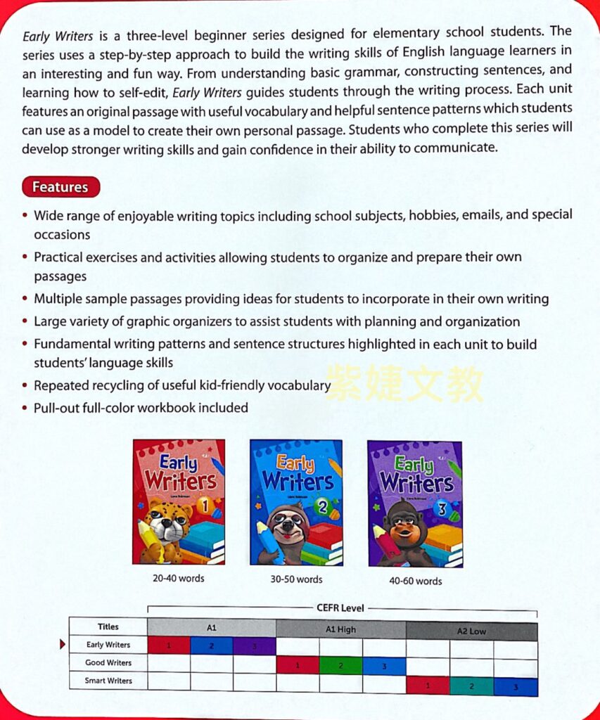 - is a three-level writing series for high beginning students of English. It emphasizes a focused, gradual approach to build the writing skills of English language learners. As the series progresses, students learn how to organize their thoughts, put sentences together, and choose suitable topic sentences and concluding sentences. The series also encourages students to edit their writing—an important part of the writing process. Students who complete this series will develop stronger writing skills and gain confidence in their ability to communicate through the written word.