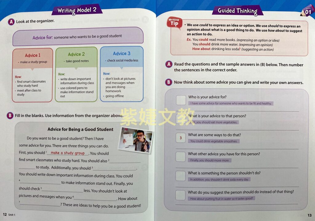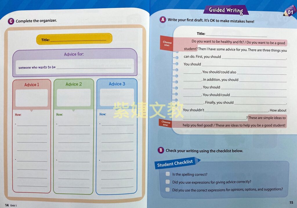 • Fundamental writing patterns and sentence structures highlighted in each unit to build students’ language skills