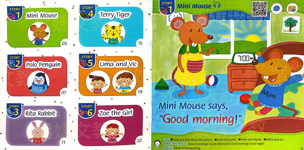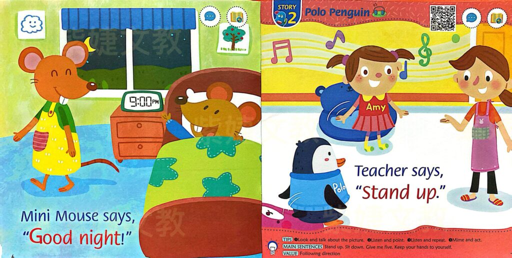 • 品格教育:教材結合說好話、好行為、彼此相愛、建立自信、保持清潔等品格美德,學美語也在養成好品格。