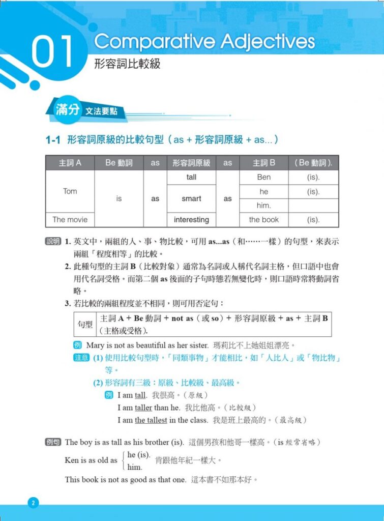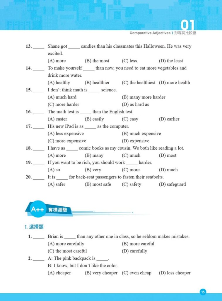 每個單元後有整合式的複習,包含選擇題、克漏字測驗、翻譯等等,整合式練習深化文法實力。