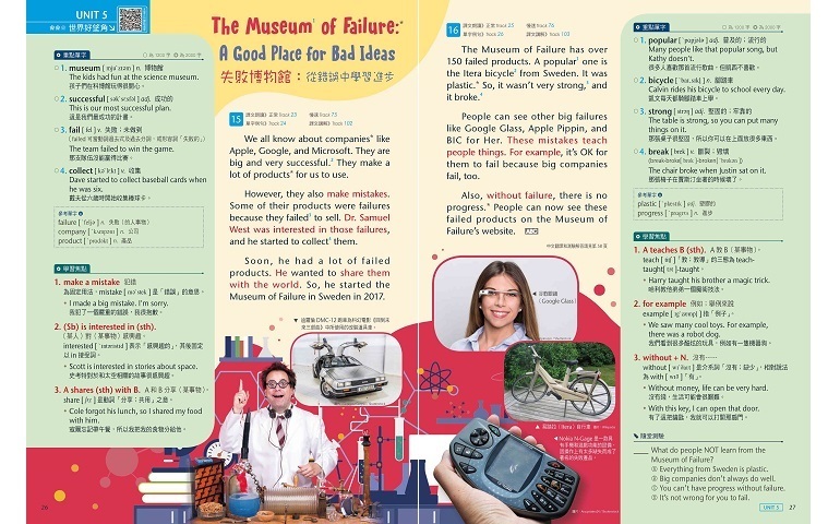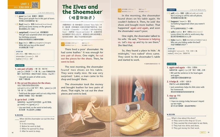 ●目標:建立基礎英語能力,透過圖像認識詞彙,藉由會話練習口說能力,故事累積英文閱讀實力,題組驗證成效。