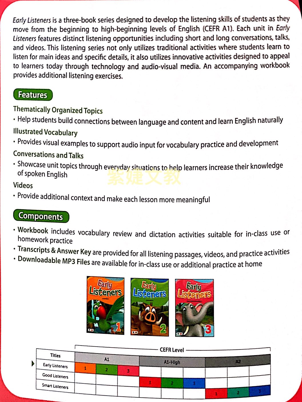 - s a three-book series designed to develop the listening skills of students as they move from the beginning to high-beginning levels of English (CEFR A1). Each unit in Early Listeners features distinct listening opportunities including short and long conversations, talks, and videos. This listening series not only utilizes traditional activities where students learn to listen for main ideas and specific details, it also utilizes innovative activities designed to appeal to learners today through technology and audio-visual media. An accompanying workbook provides additional listening exercises.