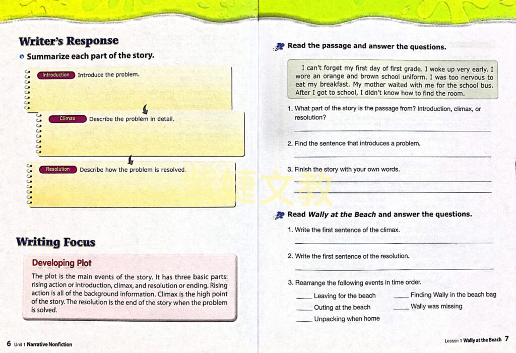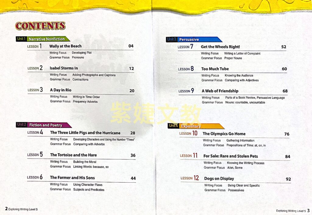 本系列教材共有六冊六個級數,包含了四個主要寫作主題,寫實事體、詩文虛構故事、說明文和說服文。