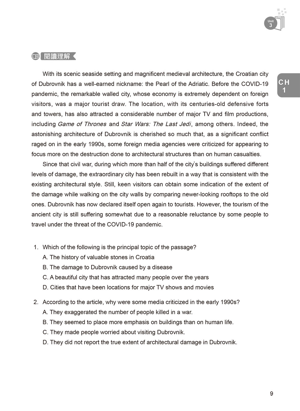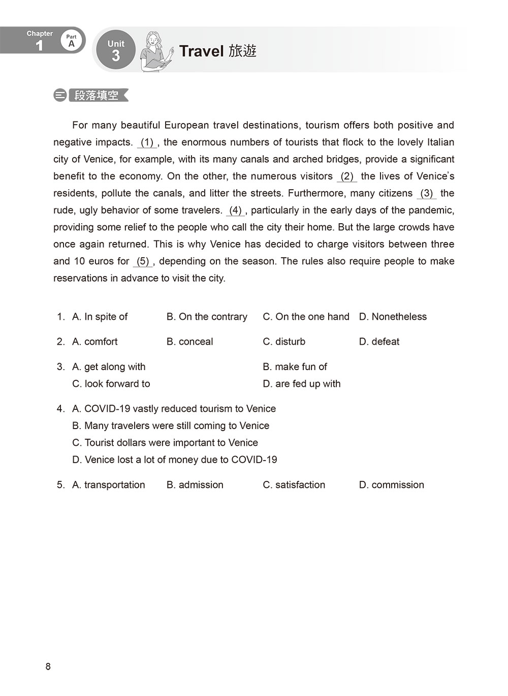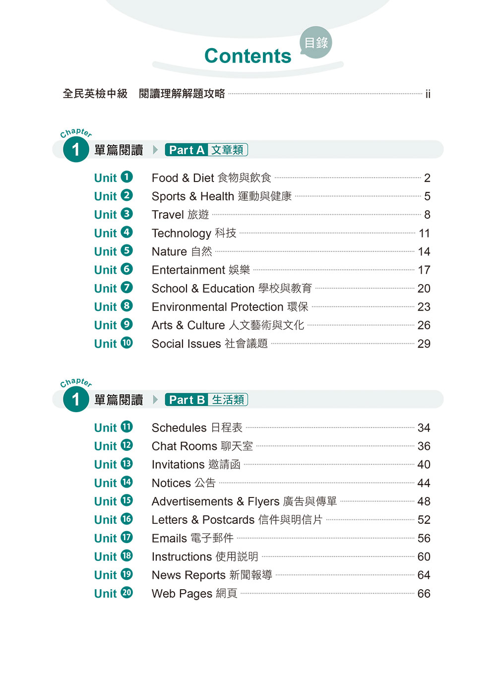 考點分析精準到位:閱讀文本涵蓋生活各層面之題材,包括飲食、旅遊、社交、教育、文化、科技、環保、社會議題等主題,融合英語的學習歷程與溝通方式,經多元層次設計,內容更貼近現代生活情境。