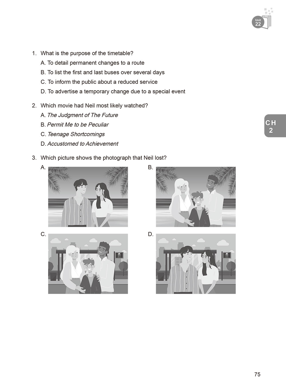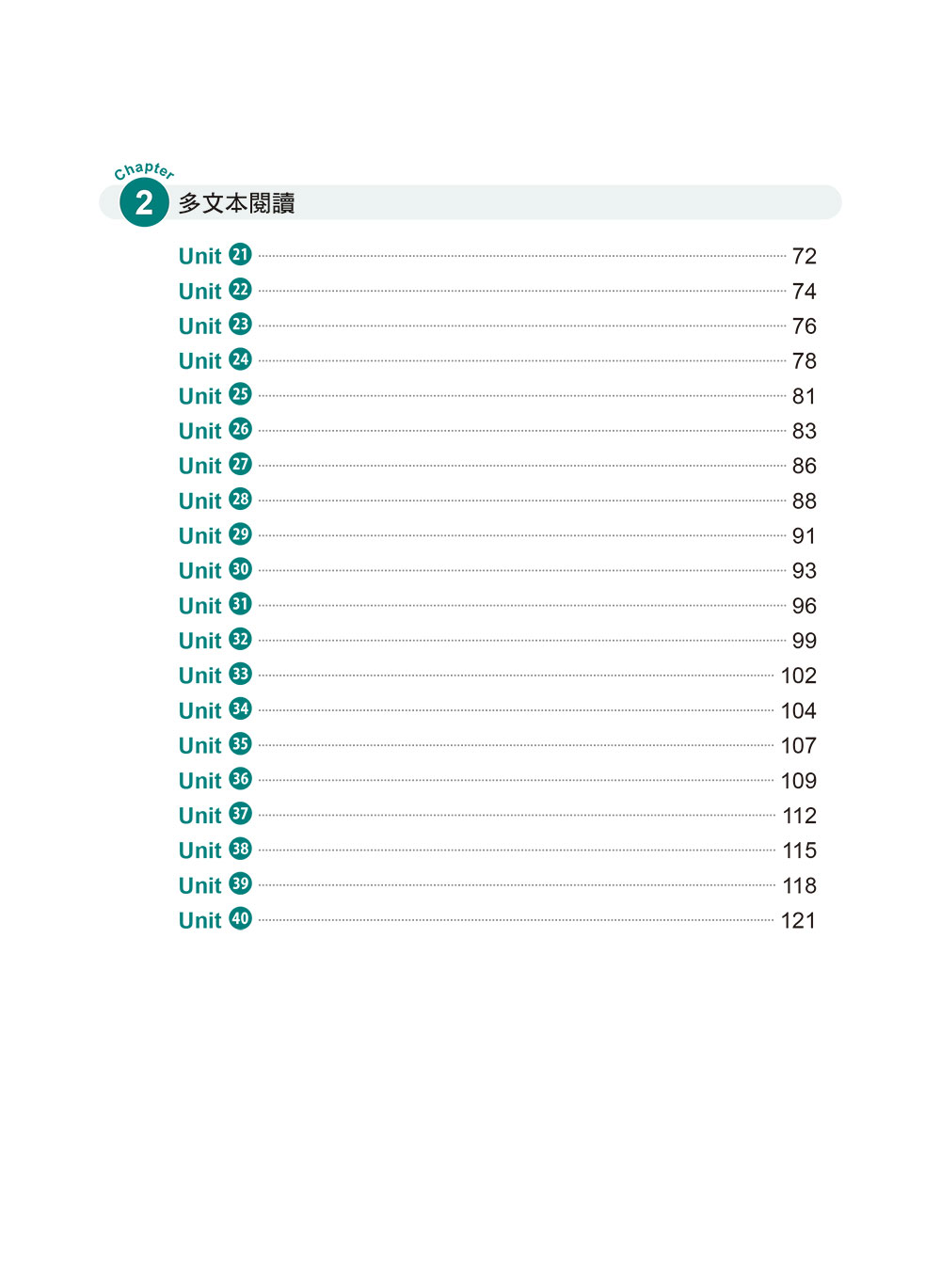閱讀題型一網打盡:呼應108國教新課綱以「素養」為核心的教育理念,並依據 LTTC 2021 年最新調整的新題型與題數編寫。「段落填空」新增「選項為句子或子句」的題型,而閱讀測驗形式涵蓋「多文本題型(含圖文)」,完全掌握新制命題趨勢。