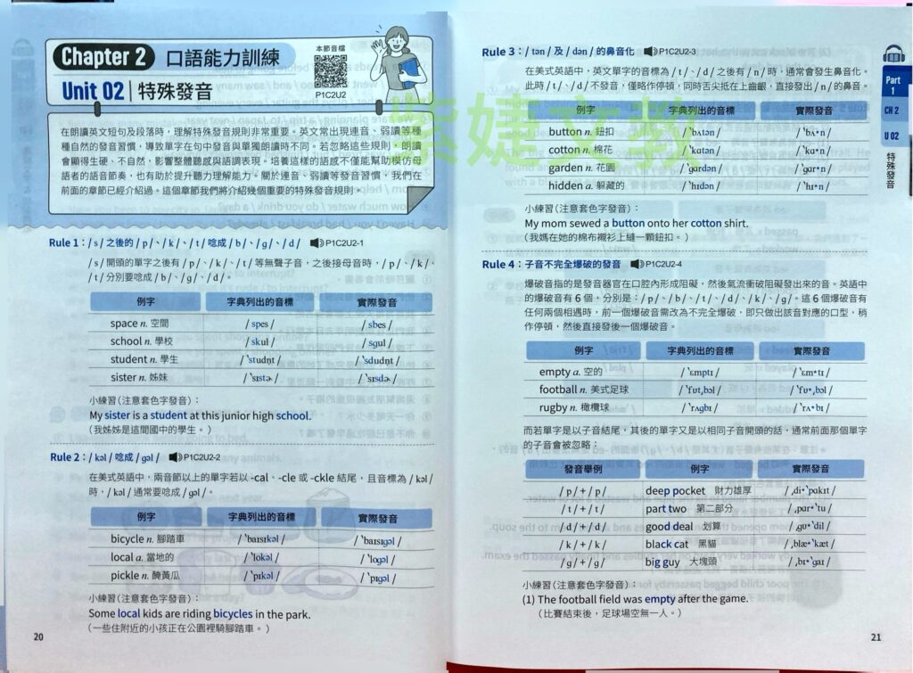 • 口語能力訓練(Chapter 2):針對發音不準的問題,從「理解文字 & 切割詞組」入手,教標記重音及連音、特殊發音規則、加入情緒、錄音比對改進。讓你的口說更清晰、自然、有節奏感,避免考官聽不懂。