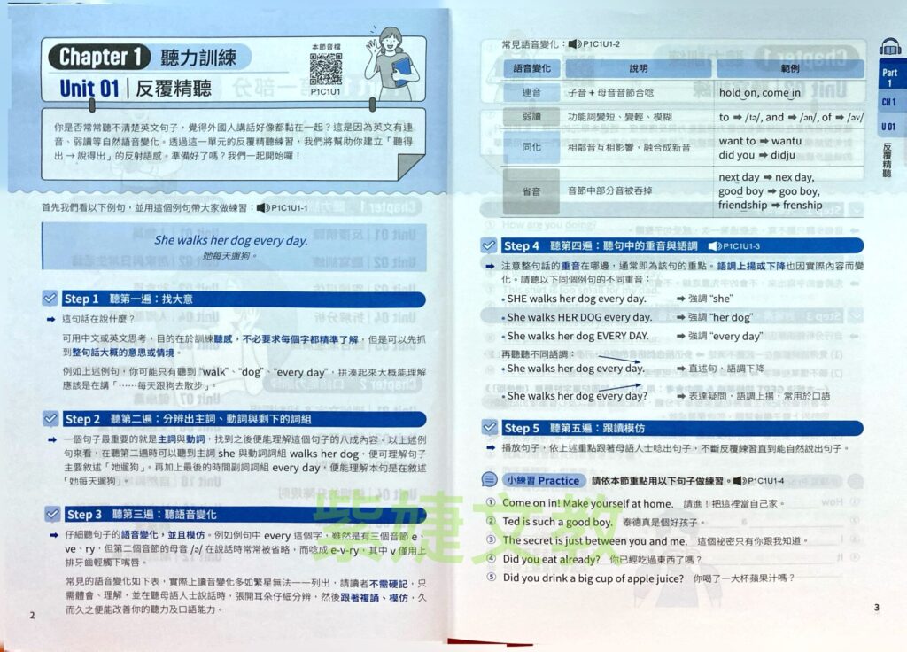 • 聽力訓練(Chapter 1):從「反覆精聽」開始,教你抓大意、分辨主詞動詞、聽語音變化(如連音、弱讀、同化、省音),再進階到聽寫、跟讀模仿、拆解分析,最後綜合漸進演練。搭配漫畫情境練習,強化即時理解與語感,讓你聽題目不再霧煞煞!