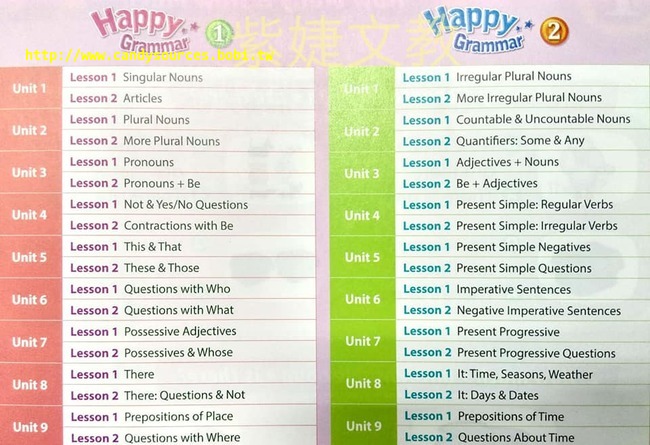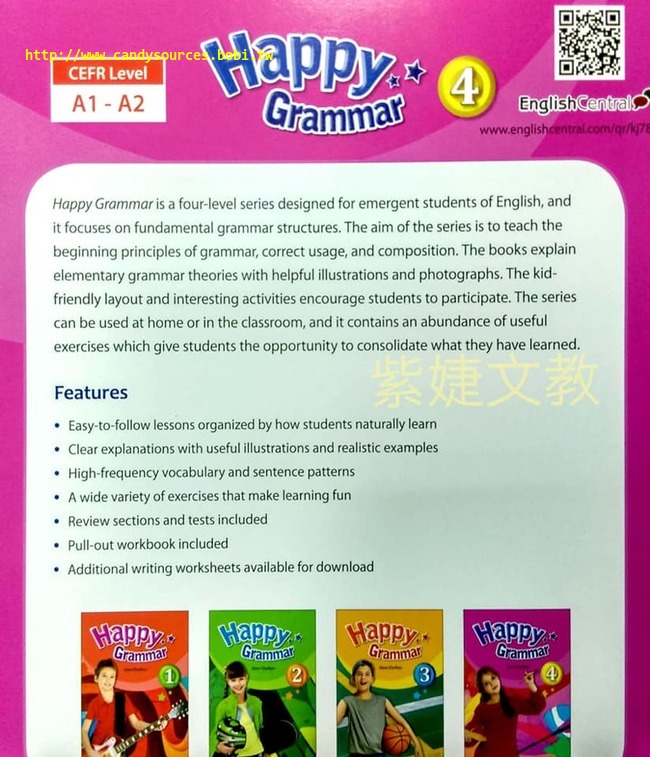 Happy Grammar is a four-level series designed for emergent students of English, and it focuses on fundamental grammar structures. The aim of the series is to teach the beginning principles of grammar, correct usage, and composition. The books explain elementary grammar theories with helpful illustrations and photographs. The kid-friendly layout and interesting activities encourage students to participate. The series can be used at home or in the classroom, and it contains an abundance of useful exercises which give students the opportunity to consolidate what they have learned.