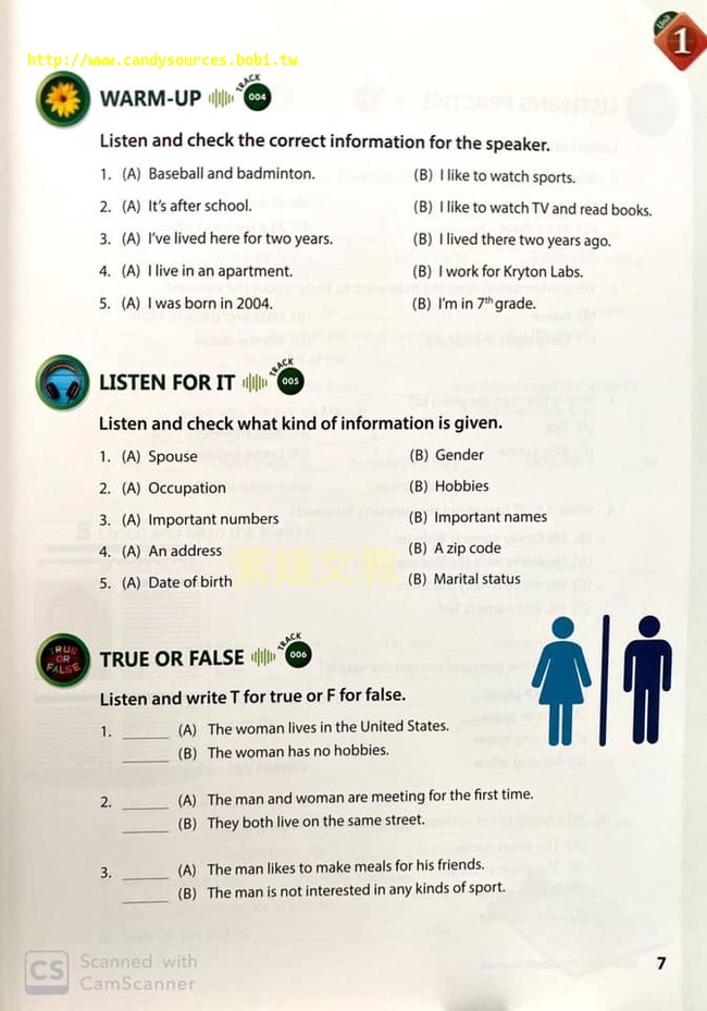 Listening tasks developed around individual sentences, short dialogs, and short talks