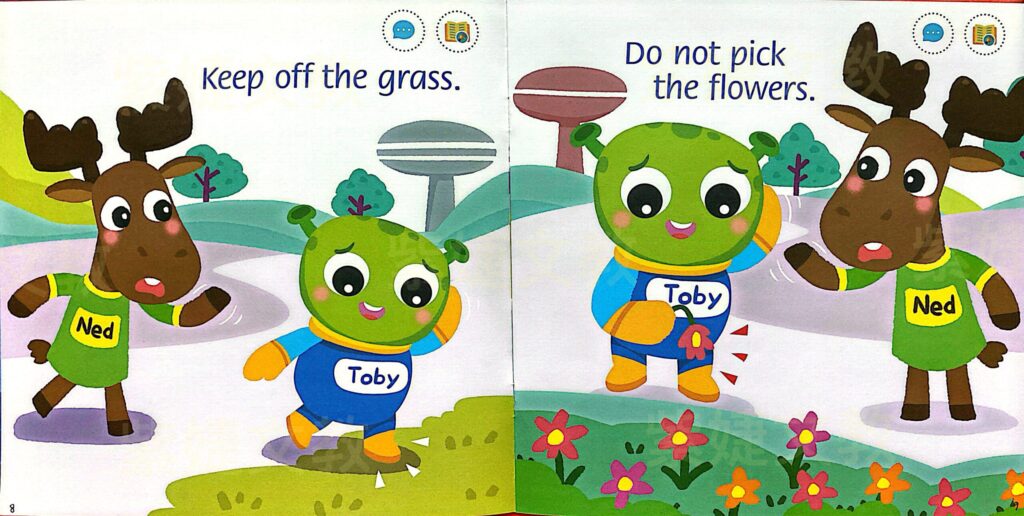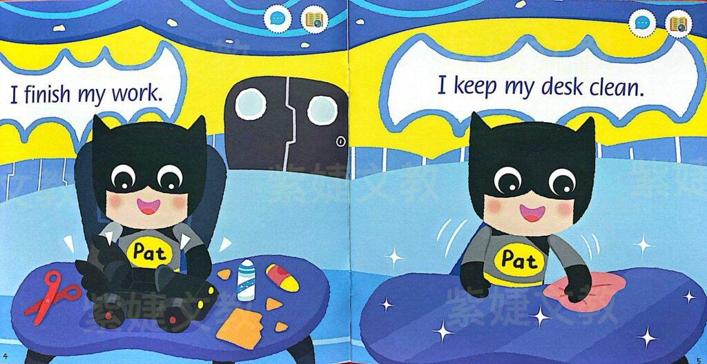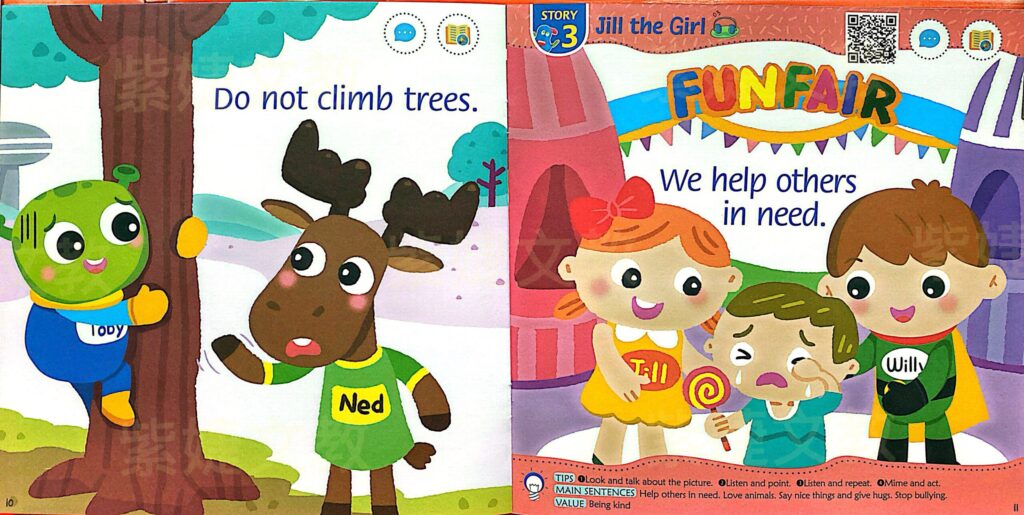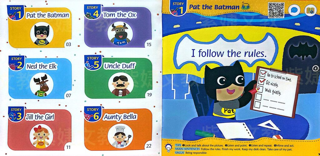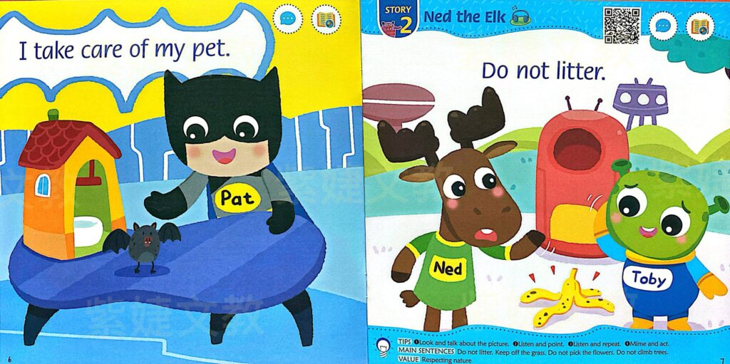 • 品格教育:教材結合說好話、好行為、彼此相愛、建立自信、保持清潔等品格美德,學美語也在養成好品格。