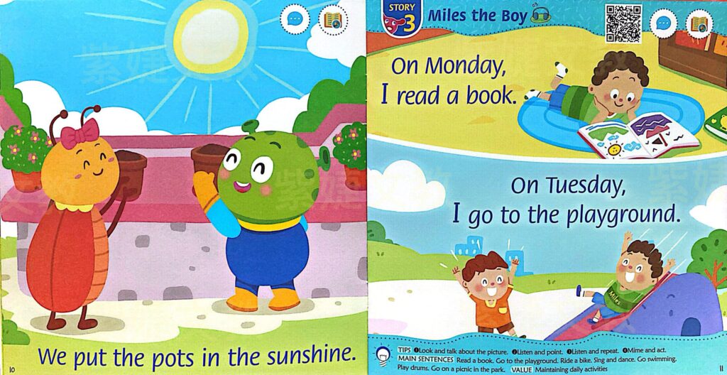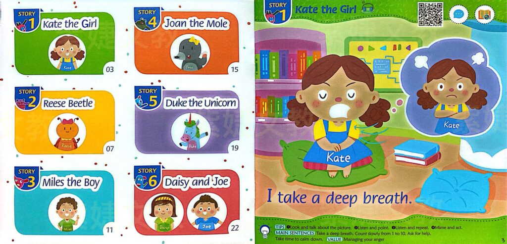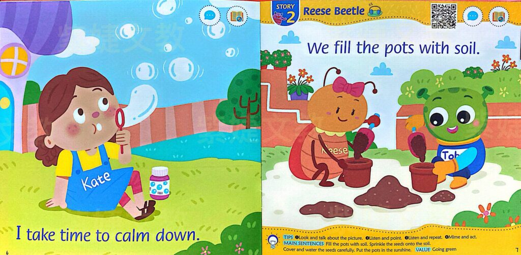 • 品格教育:教材結合說好話、好行為、彼此相愛、建立自信、保持清潔等品格美德,學美語也在養成好品格。