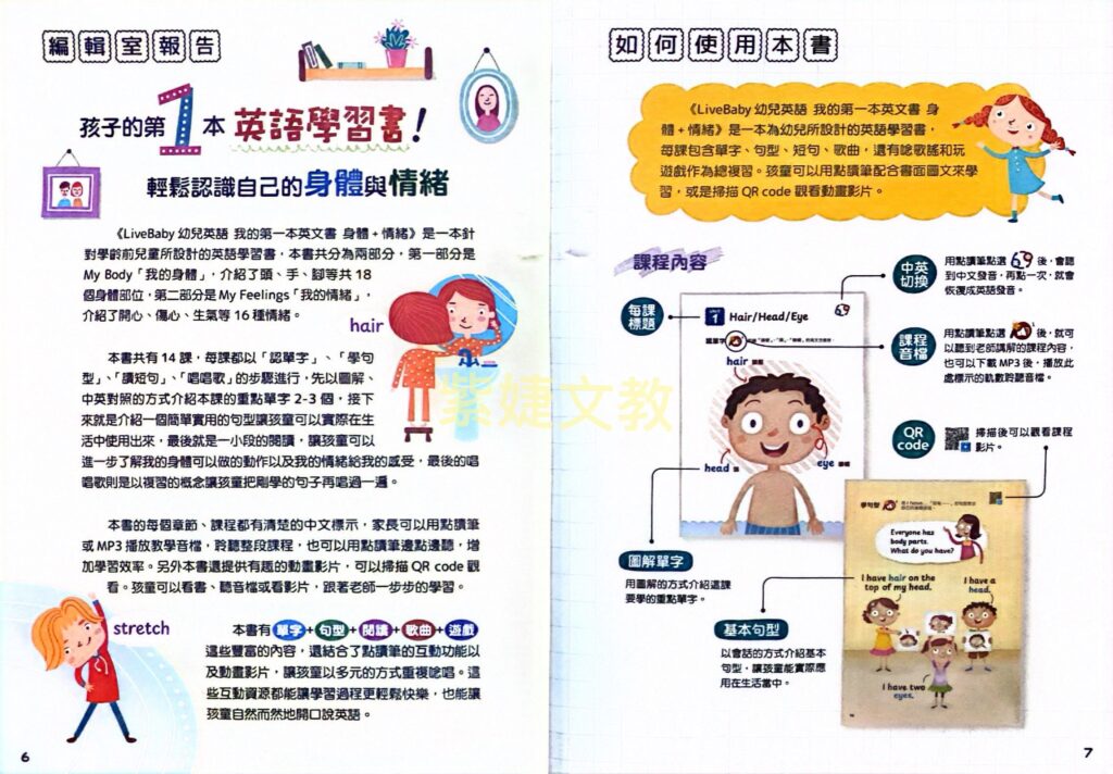 針對學齡前兒童所設計的英語學習書,本書共分為兩部分,第一部分是My Body「我的身體」,介紹了頭、手、腳等共18個身體部位,第二部分是My Feelings「我的情緒」,介紹了開心、傷心、生氣等16種情緒。