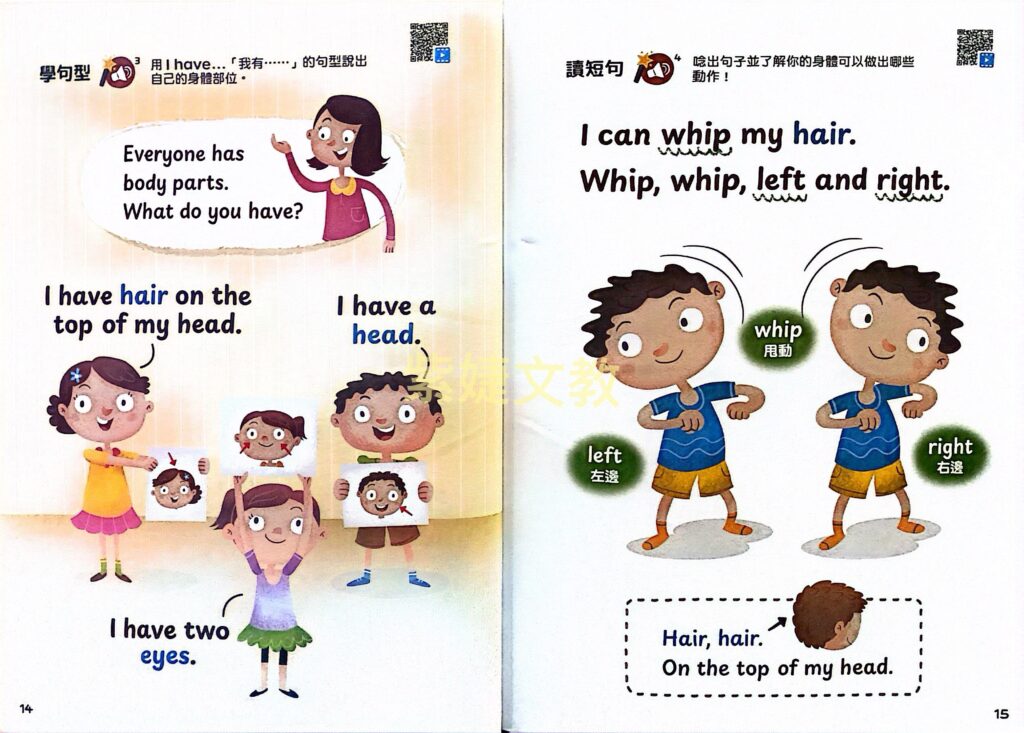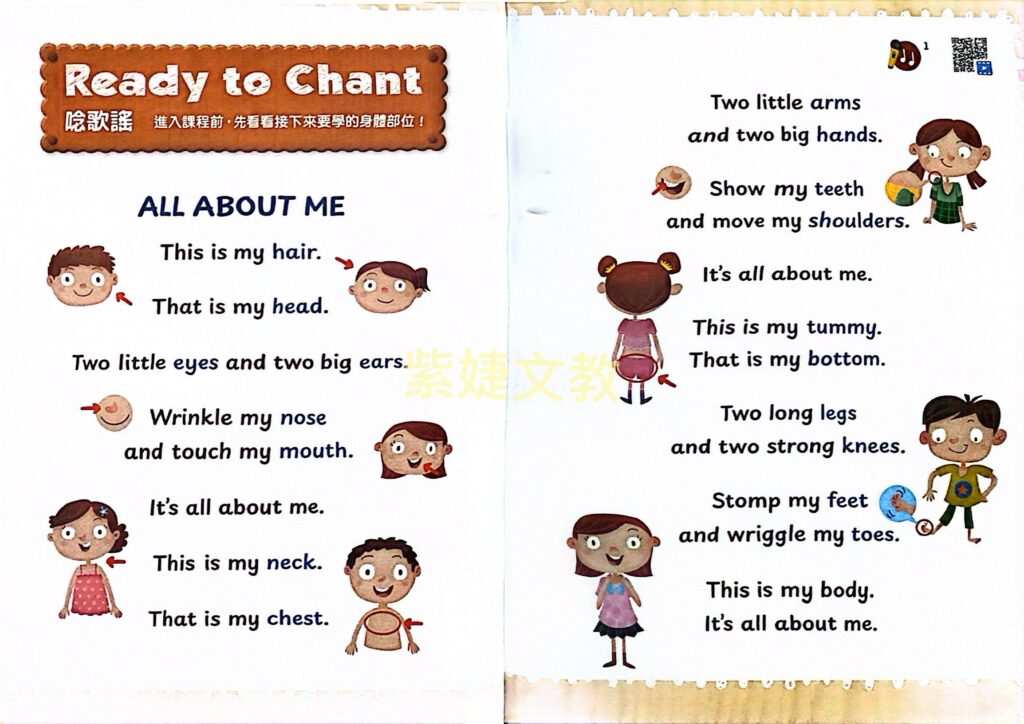 透過短句閱讀輕鬆有趣的內容了解自己的身體和情緒。也可以歌曲的形式將剛剛學過的單字和短句用唱的唱出來。