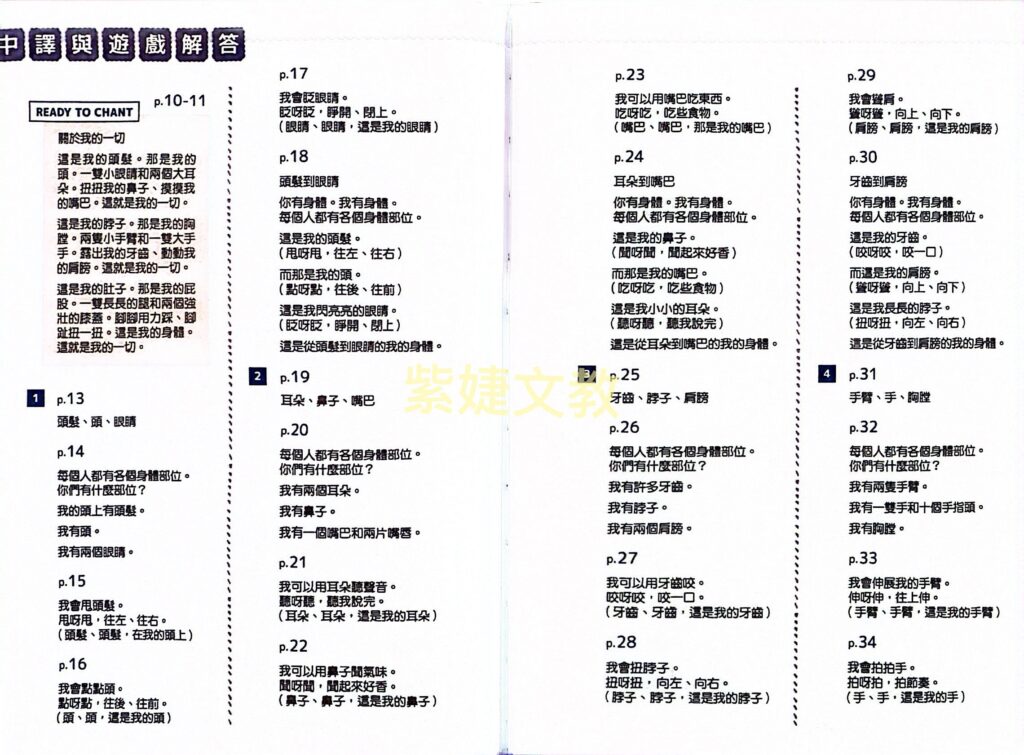 在My Body和My Feelings的單元前都會先有一個「唸歌謠」的單元,讓孩童在正式進入課程之前先看看接下來要學的身體部位和情緒共有哪些,可以讓孩子事先了解再正式的一課一課的學習。在最後也會有一個遊戲,讓孩童動動手、發揮創意,在玩的過程中再次複習之前學過的東西。