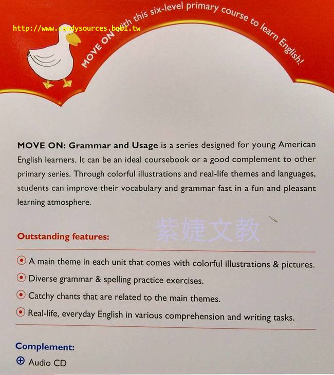 《MOVE ON!》是一系列兒童美語的文法教材,涵蓋生活用語、單字、句型與書寫。本書共分六級,可做為主教材或搭配的副教材使用。內容由兒童美語專家林素娥博士和David Doyle研發,緊扣家庭、學校、玩樂等貼近生活的主題,配上生動、繽紛的插圖和有趣、多元的練習,