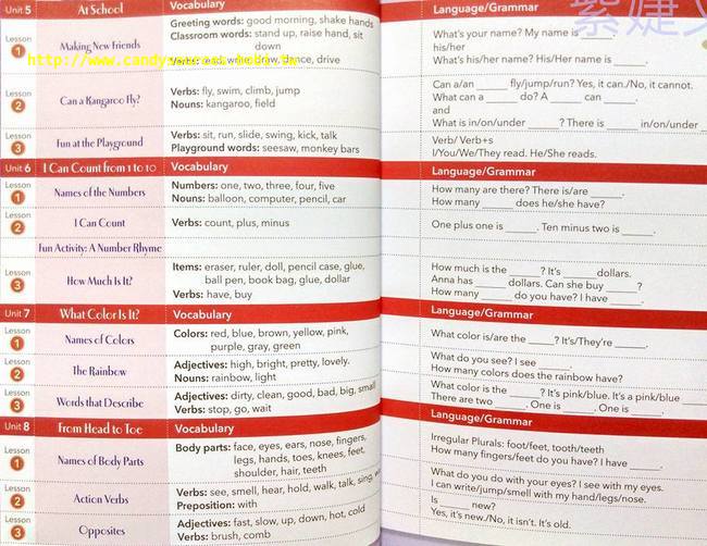 1. 共分為八單元,每單元三課,涵蓋基本生活用語和單字。