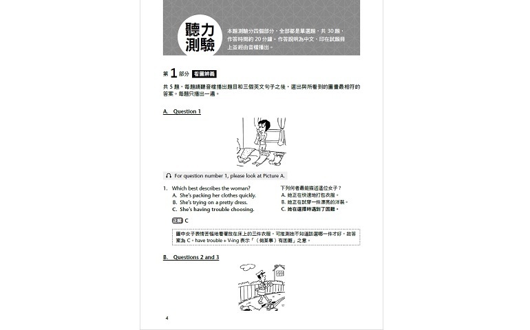 - 以聽力及閱讀測驗為主軸編寫,符合考生練習需求