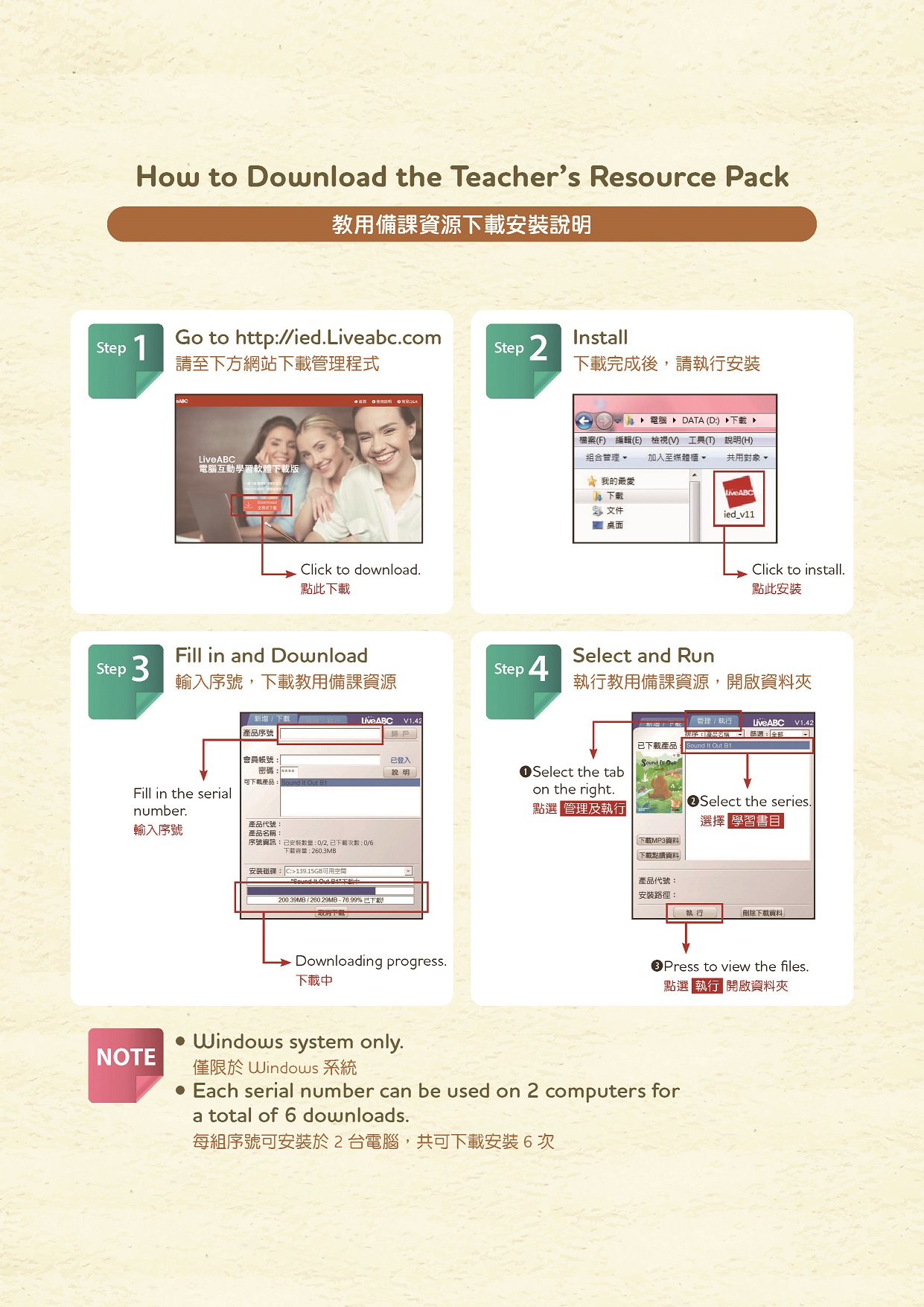 - 輸入本產品序號後點選可下載之產品進行互動學習內容下載,下載完成後請至「管理/執行」頁面執行互動學習系統。詳細安裝步驟請見網站之使用說明。