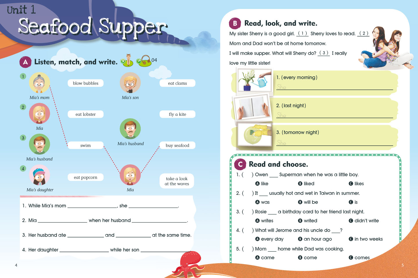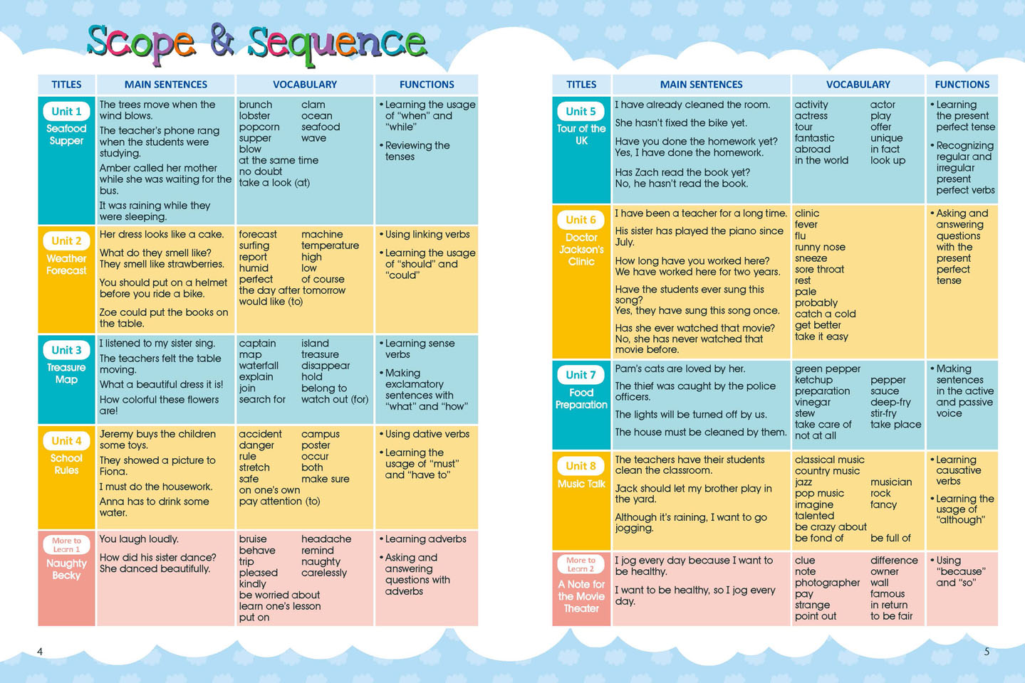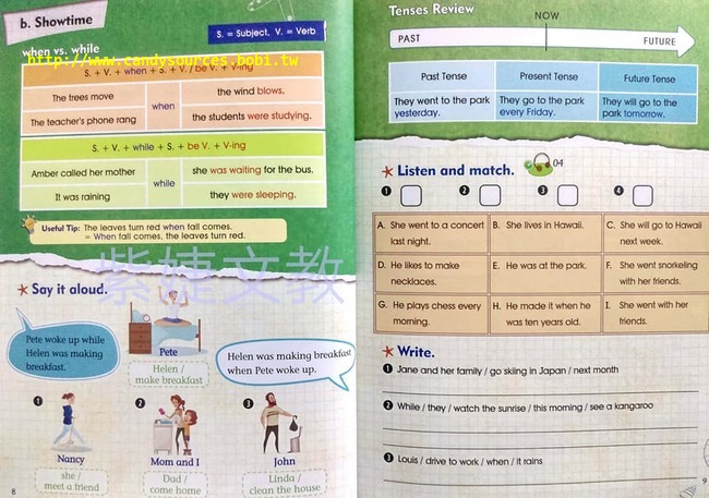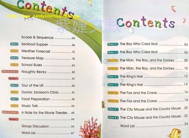 ●孩子到了中階學習階段,文法點加深,讀寫能力會漸漸被培養起來,孩子開始可以閱讀短文,練習引導式短文寫作,慢慢具備可以深度學習英文的能力,為下一階段做好準備。Book 7~8★學習者年紀:小學四年級~五年級