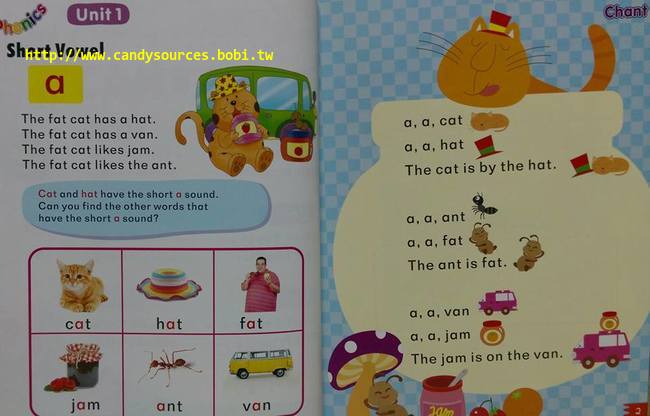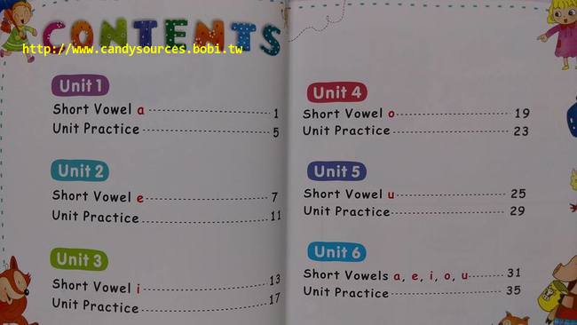 每冊6個單元,每單元皆包含:自然發音規則、代表單字、節奏朗文/短文、複習活動、聽力練習。